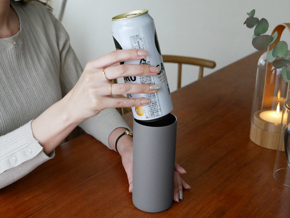 サイズに合わせてピタッとフィットするから取り付けも簡単。 冷えた缶飲料をそのままセットすれば飲み頃をしばらく堪能できます。