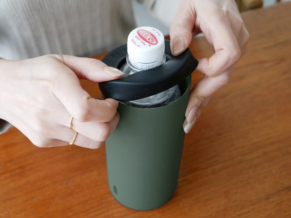 「BOT. GO MUG」には本体上部に取り付け可能な〈ラバーキャップ〉がついています。 ペットボトル飲料をセットした後、このラバーキャップを取り付けることで、ボトルをしっかりおさえて固定することが可能に。
