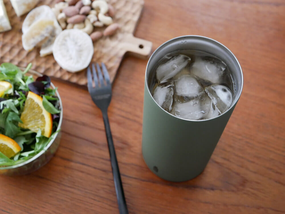 キンキンに冷えた飲み物を飲みたいとき、これなら氷も一緒に入れて飲めますね。 淹れたてのコーヒーをこのマグで楽しむこともできちゃいます。