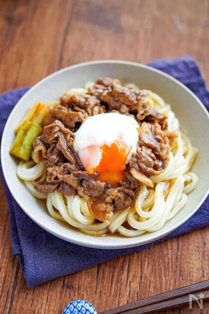 腹ペコの家族も「美味しすぎる」と大絶賛♡みんなの胃袋を鷲掴みにする、こってり&ボリューミーな牛すき温玉うどん。ジューシーなお肉&とろとろの温泉卵と一緒に食べれば、思わず幸せ気分に。疲れも吹き飛ぶスタミナメニューです。(調理時間:10分)