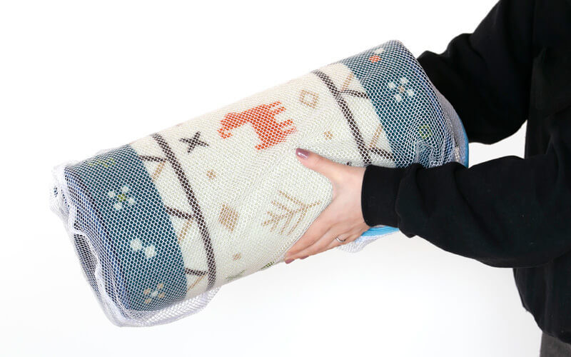 持ち上げても軽く、簡単に丸めることができます。そのまま洗濯ネットに入れて洗濯機で丸洗いができるので、汚れてもお手入れは簡単です。ただし、ドラム式洗濯機では扱うことはできないのでご注意ください。
