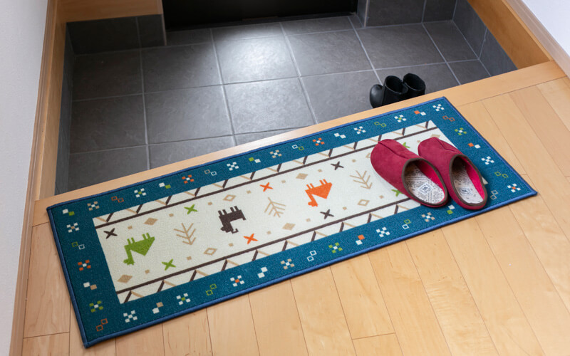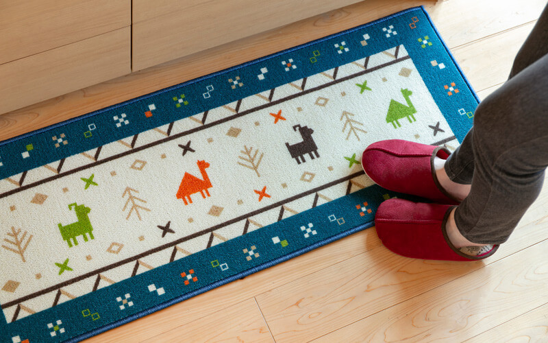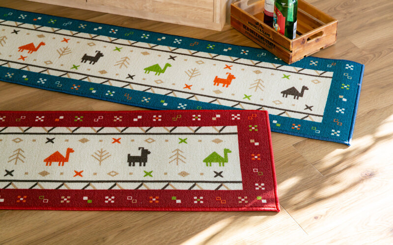 キッチンマットだけでなく、ソファ前やベッドサイド、玄関、ベランダの出入り口など、お部屋のいろんな場所でちょっと目を引くポイントマットにもなります。 お気に入りの場所に敷いて楽しむのも良いですね!