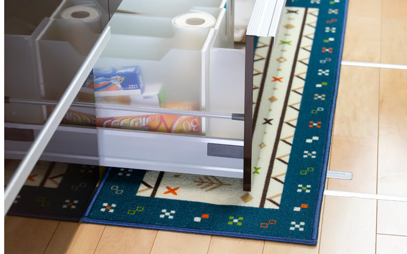 シンク下の引き出しなども引っかからないように設計された厚みなので、「引き出しを開けたらキッチンマットめくれた!」といった日々の小さなストレスにも悩まされないのは嬉しいですよね。