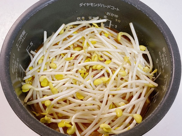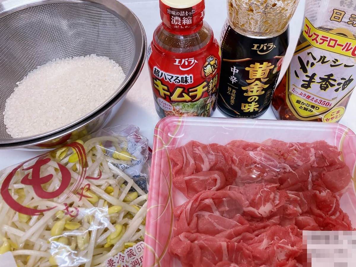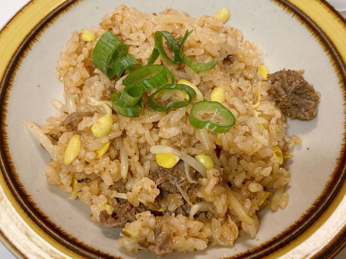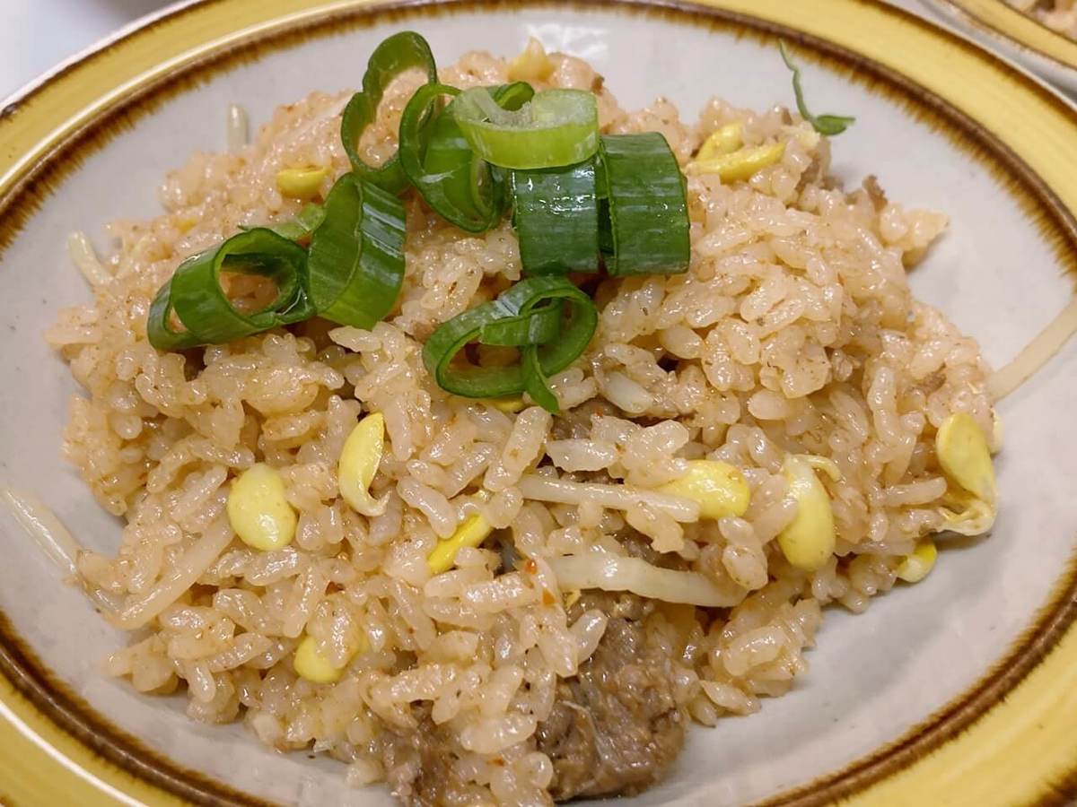 豆もやしの食感と黄金の味で下味をつけた牛肉、キムチ味の炊き込みご飯という盤石すぎる体制で、他におかずがなくてもこれだけで満足できます。