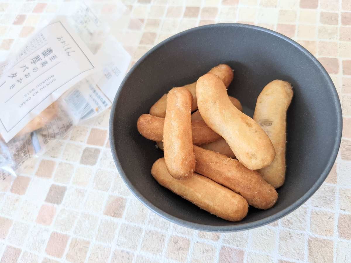 「おかき」と書いてあるんですが、ラスクのような食感や甘さもあって、不思議とハマるんですよね(笑)。 サクサク軽い食感で、食べ始めると手が止まらなくなります。