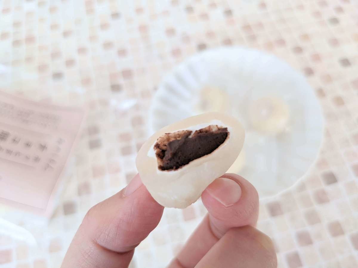 チョコクリームにはガーナ産カカオを使用。 マシュマロとお餅で包んでいるので、ふわふわもちもちな食感がクセになります。 ティータイムのお供に、または小腹が空いたときにあると嬉しいお菓子です。