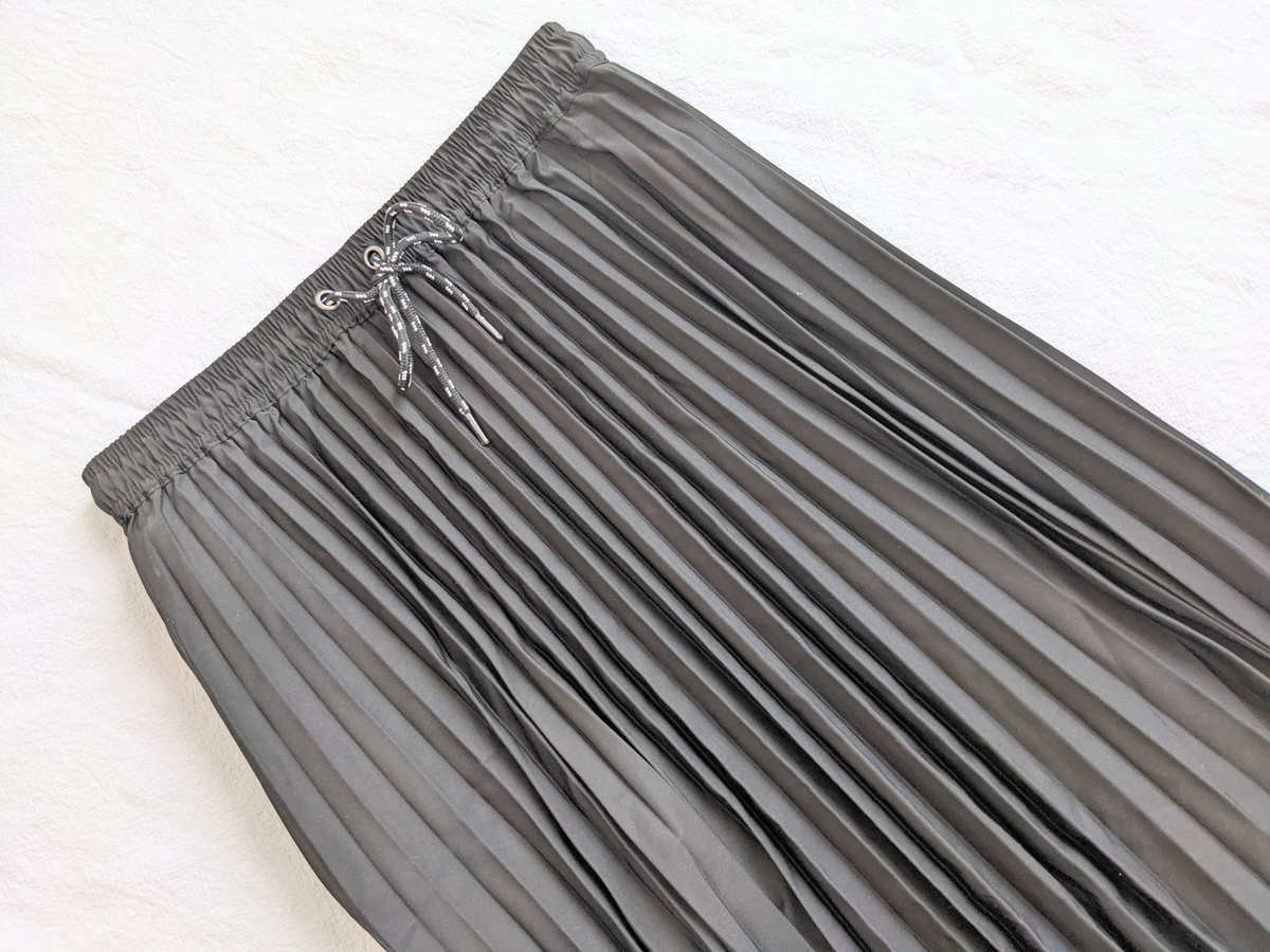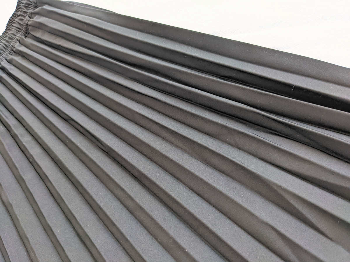 高撥水の特殊な生地を使用しており、水を弾いてくれるため雨の日でも安心して履けます。 素材はポリエステル100%。ハリ感と光沢感があり、動くたびにプリーツが揺れて素敵です。