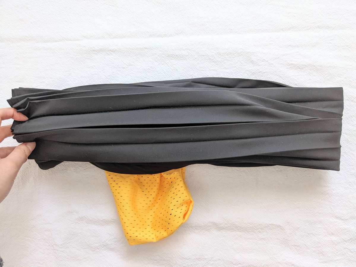 収納方法は、まずスカートを縦に2回ほど畳みます。 その後、スカートの丈をこのように半分に折り曲げます。