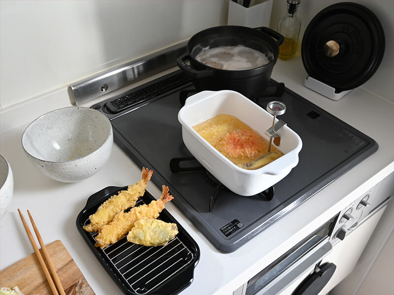 富士ホーローの角形天ぷら鍋は、小回りの利く働きもの。隣のコンロの邪魔をすることなく、他のメニューとの同時進行で揚げ物が作れるから、支度がスピーディーにはかどります。