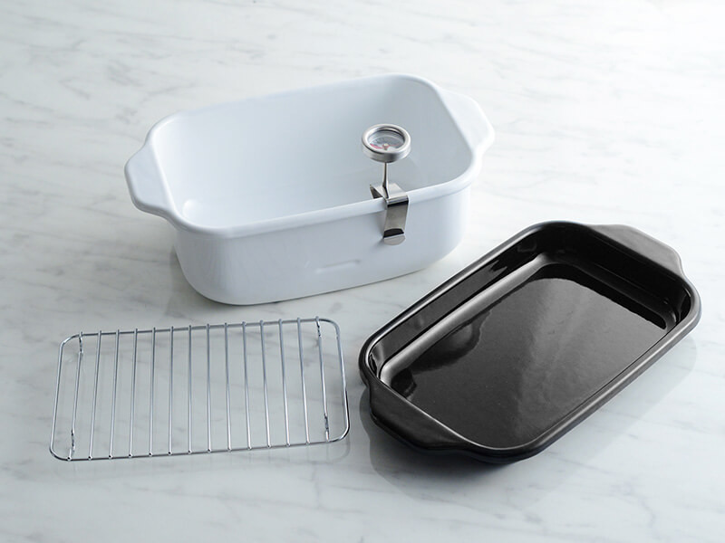 揚げ鍋のほかに、防水型の温度計・トレイ・すのこ網もセットに。トレイは衣をつけるバットにしたり、すのこ網をセットして油切りに使うこともできますよ。