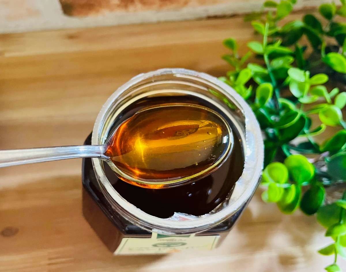 開けてみると、カンロ飴にも似た香りでいい匂い。 色味も一般的なはちみつより濃いカラメル色です。