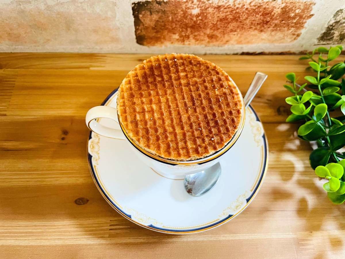 ちなみにストロープワッフルのサイズは直径約8㎝。 これよりも大きい口のカップだと乗せられないのでご確認ください。