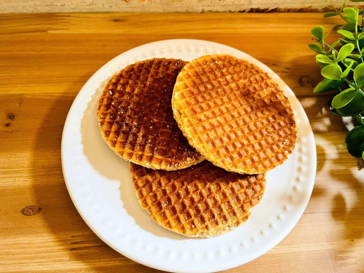 ストロープワッフルは薄いクリスピーワッフルを半分にスライス。 そこにとろりとしたキャラメルシロップをサンドしたオランダの伝統菓子です。