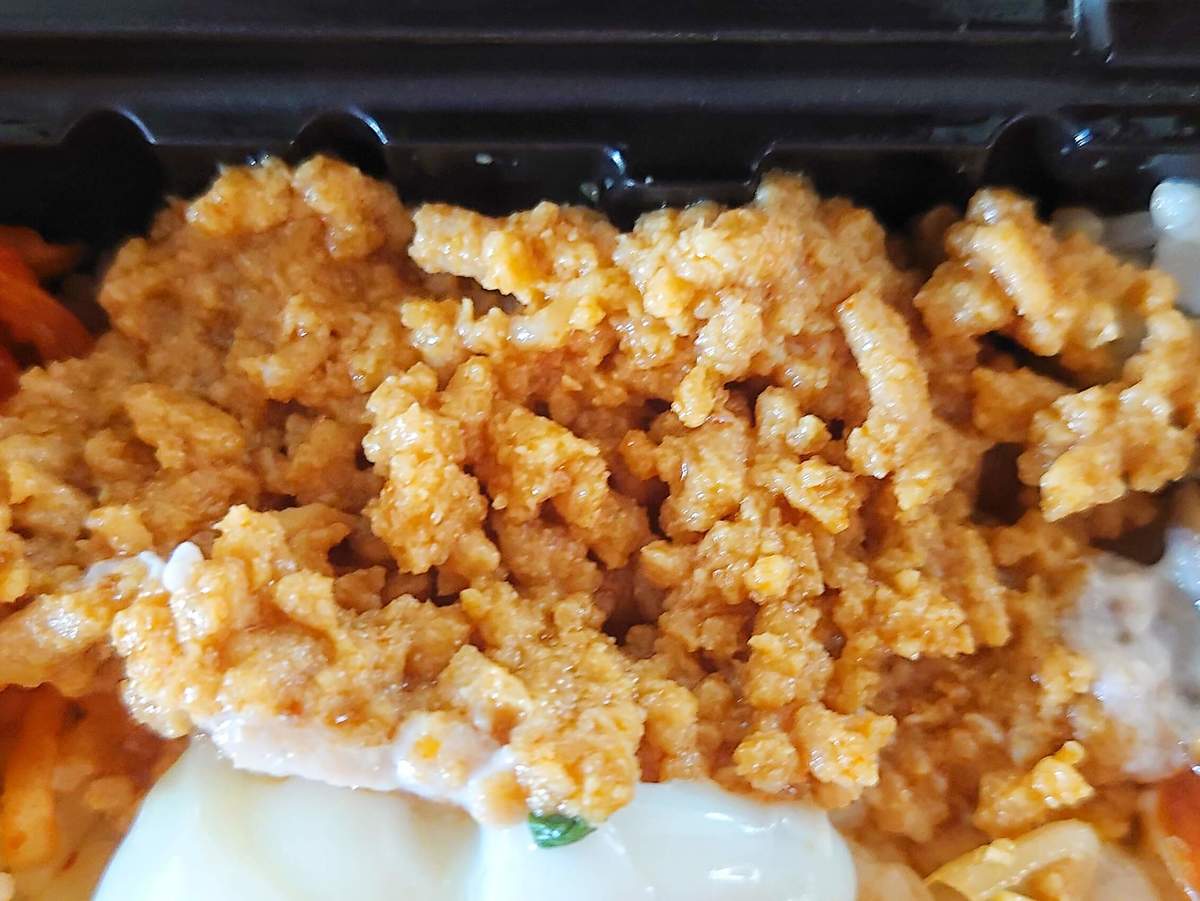 温泉卵の量サイドに入っているそぼろは、食べてみたら甘辛味噌の鶏ひき肉。