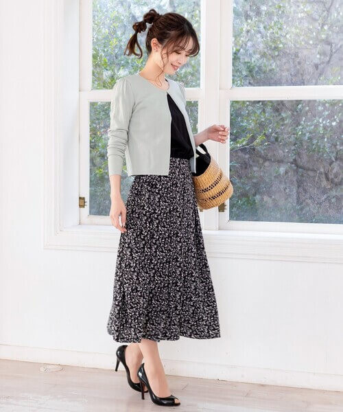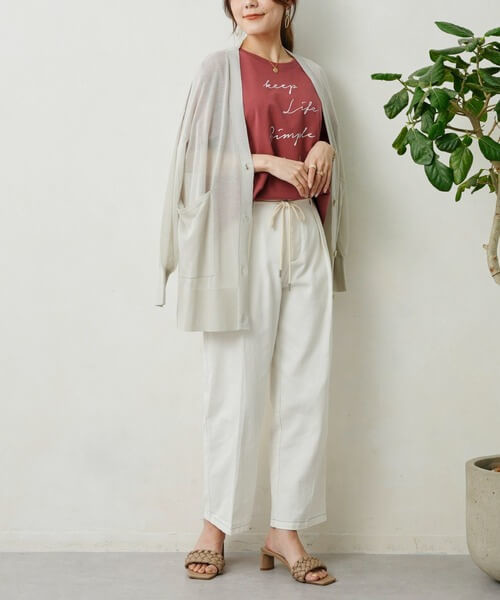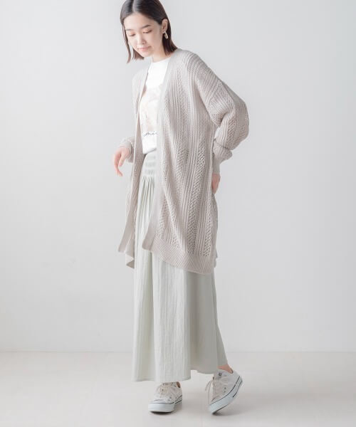 カーディガンは透け感のある涼しげな素材なので、春から夏にかけて活躍します。夏場の冷房対策にもマスト!