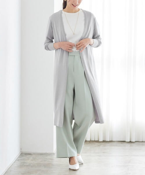 明るい雰囲気のきれいめコーデを作るなら、ライトグレーのカーディガンがおすすめ。編みが細かくストレッチ性もあるため、動きやすいのも特徴です。