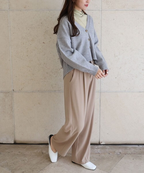 写真のようにワイドパンツと合わせて、カジュアルなスタイルを楽しむのもおすすめ。アッシュ系のグレーカーディガンなので、垢抜けた雰囲気を纏えます。