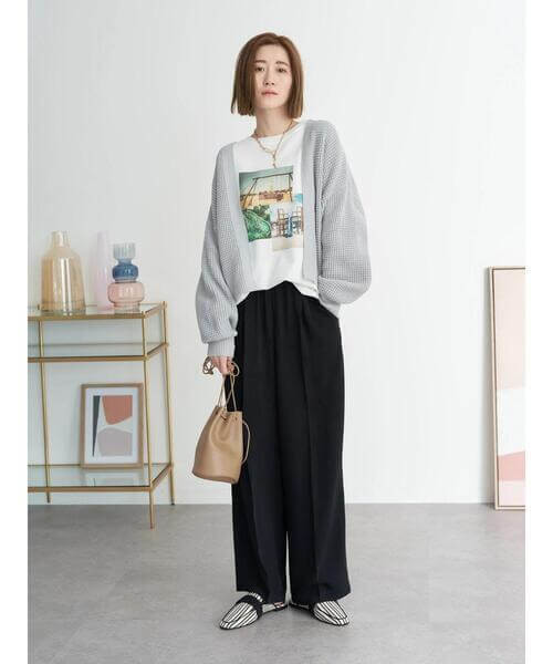 オーバーサイズのTシャツ&カーディガンと黒のシンプルなパンツを合わせることで、ゆるすぎないシックなカジュアルスタイルが完成します。