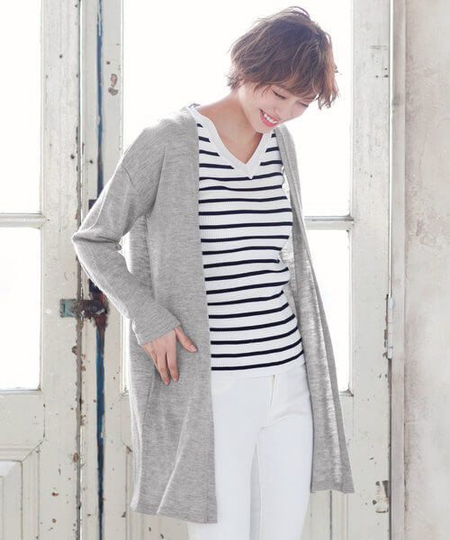 ボーダートップス+白のパンツスタイルで作ったモノトーン風コーデの上にグレーカーディガンを羽織れば、優しげな印象を与えられそうです。