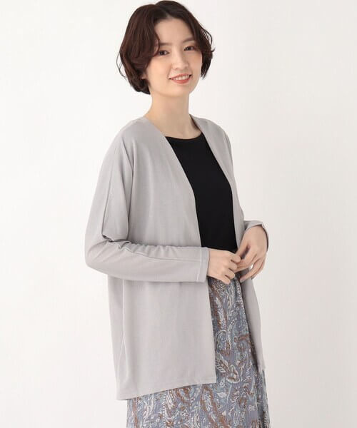 紫外線を通しにくくする素材を使用したカーディガンは、春から夏にかけて重宝するアイテム。ボタンレスなので、オフィスでもサラッと羽織れるのがポイントです。