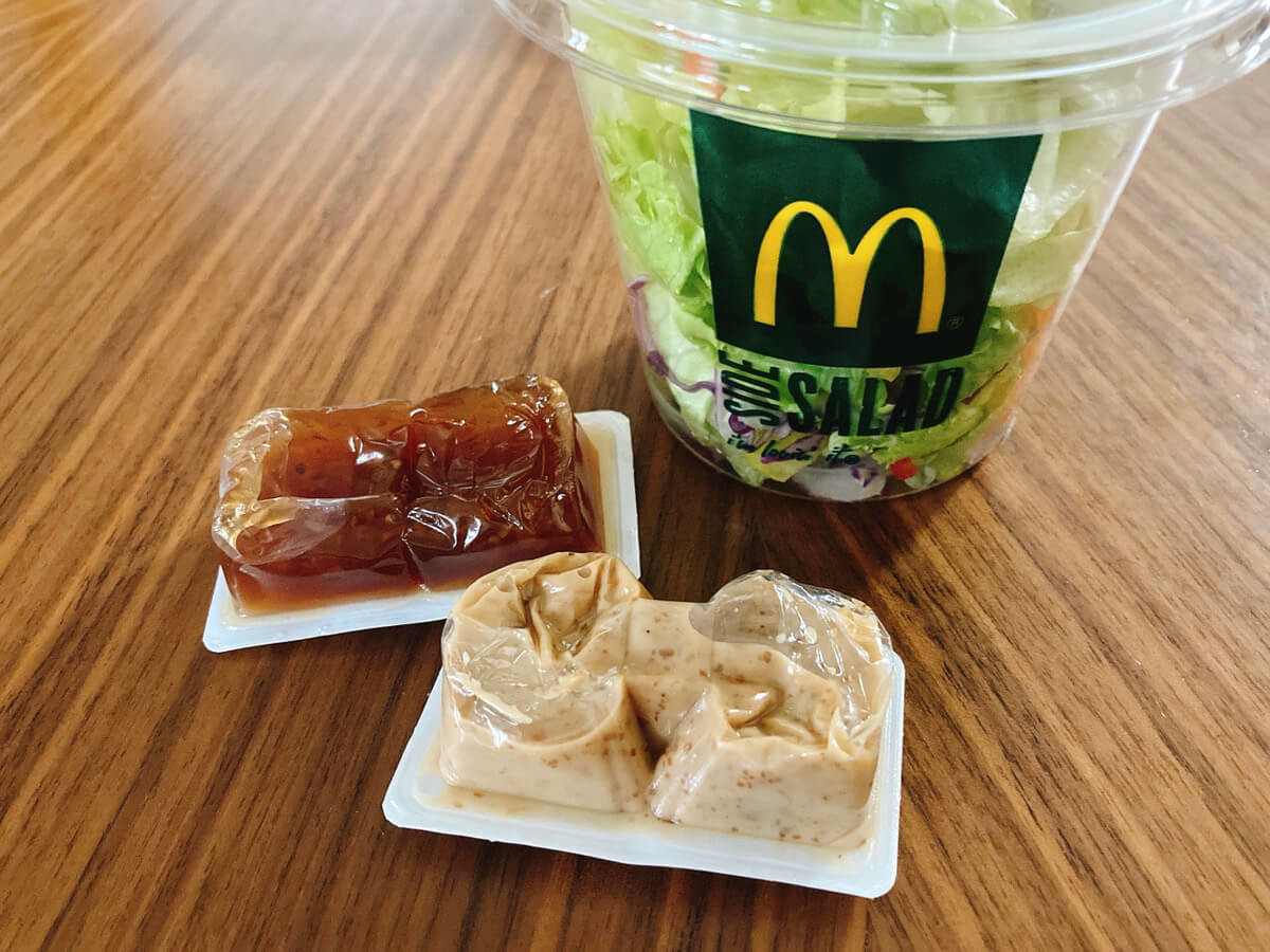 ちなみに、サイドサラダのドレッシングも、「焙煎胡麻」「たまねぎ」を2種類付けてもらえますよ。