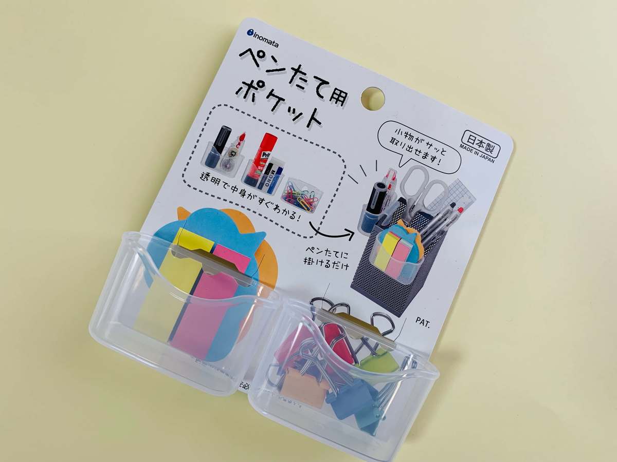 「見た瞬間ビビビッ!」ときて思わず購入したのが「ペンたて用ポケット(110円)」。透明なので、小さいクリップ類も見やすく収納できます。