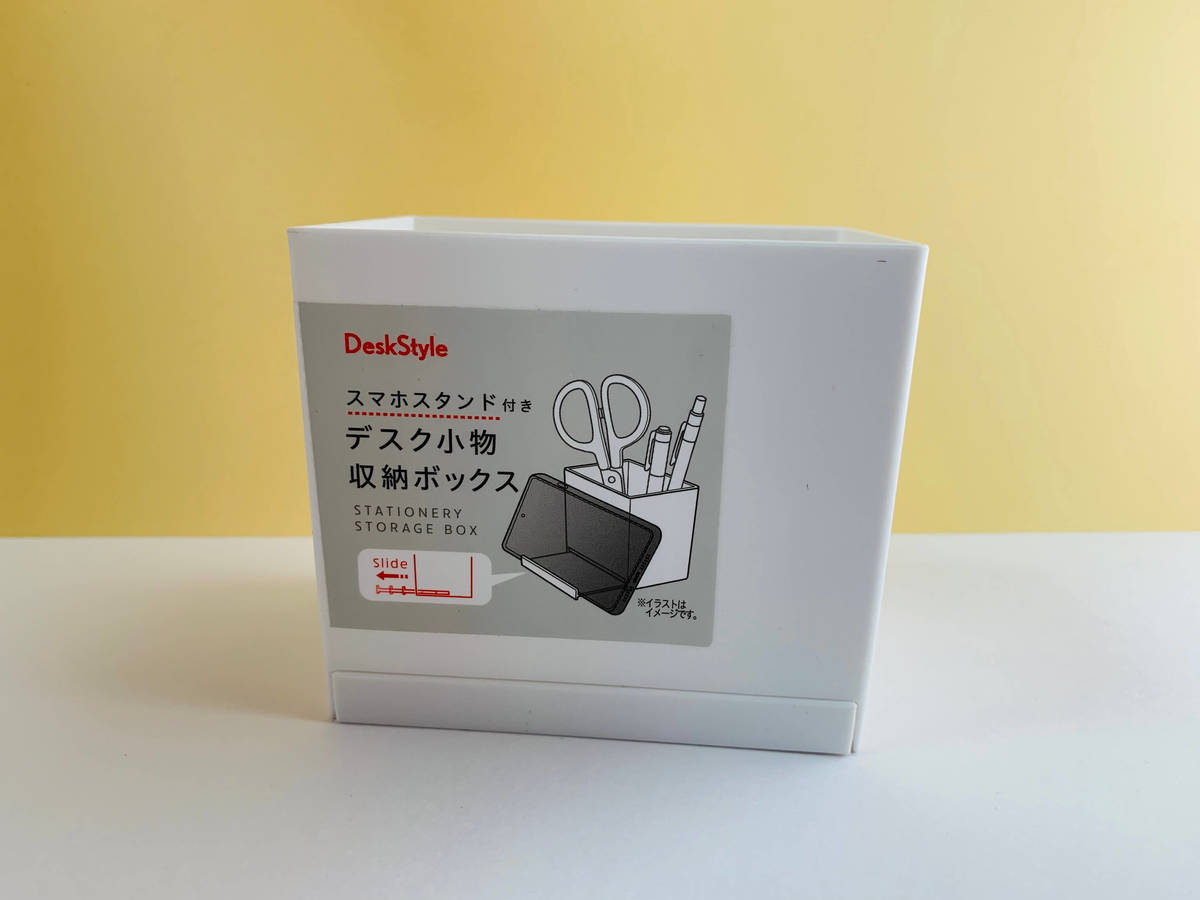 その名も、スマホスタンド付き「デスク小物収納ボックス(110円税込)」。作業中にスマホを置きたいときにサッと使えて、メモする時にも便利。