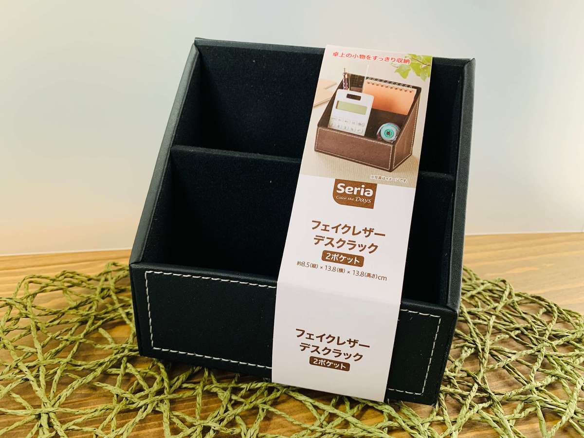 高見えするアイテムを探していて見つけたのが、セリアの「フェイクレザーデスクラック(110円税込)」。仕切りがあるので文房具や小物類もスッキリ収納できます。