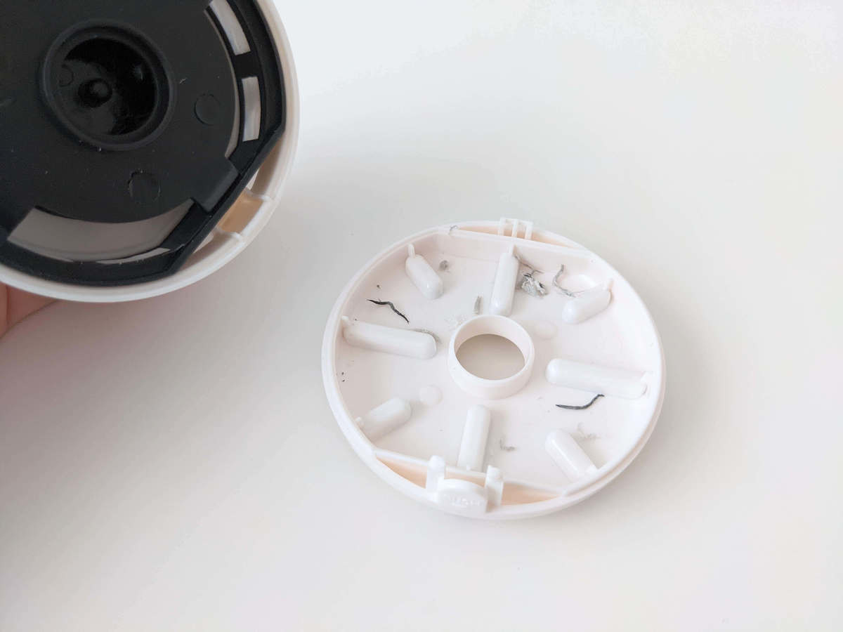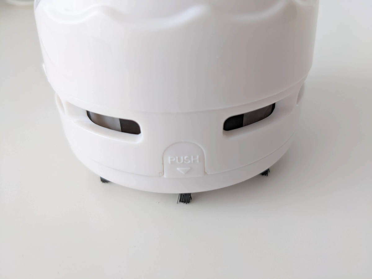 ゴミを捨てるときも本当に簡単なんです。 ここのプッシュボタンを押すと、本体の下部が外れるようになっています。