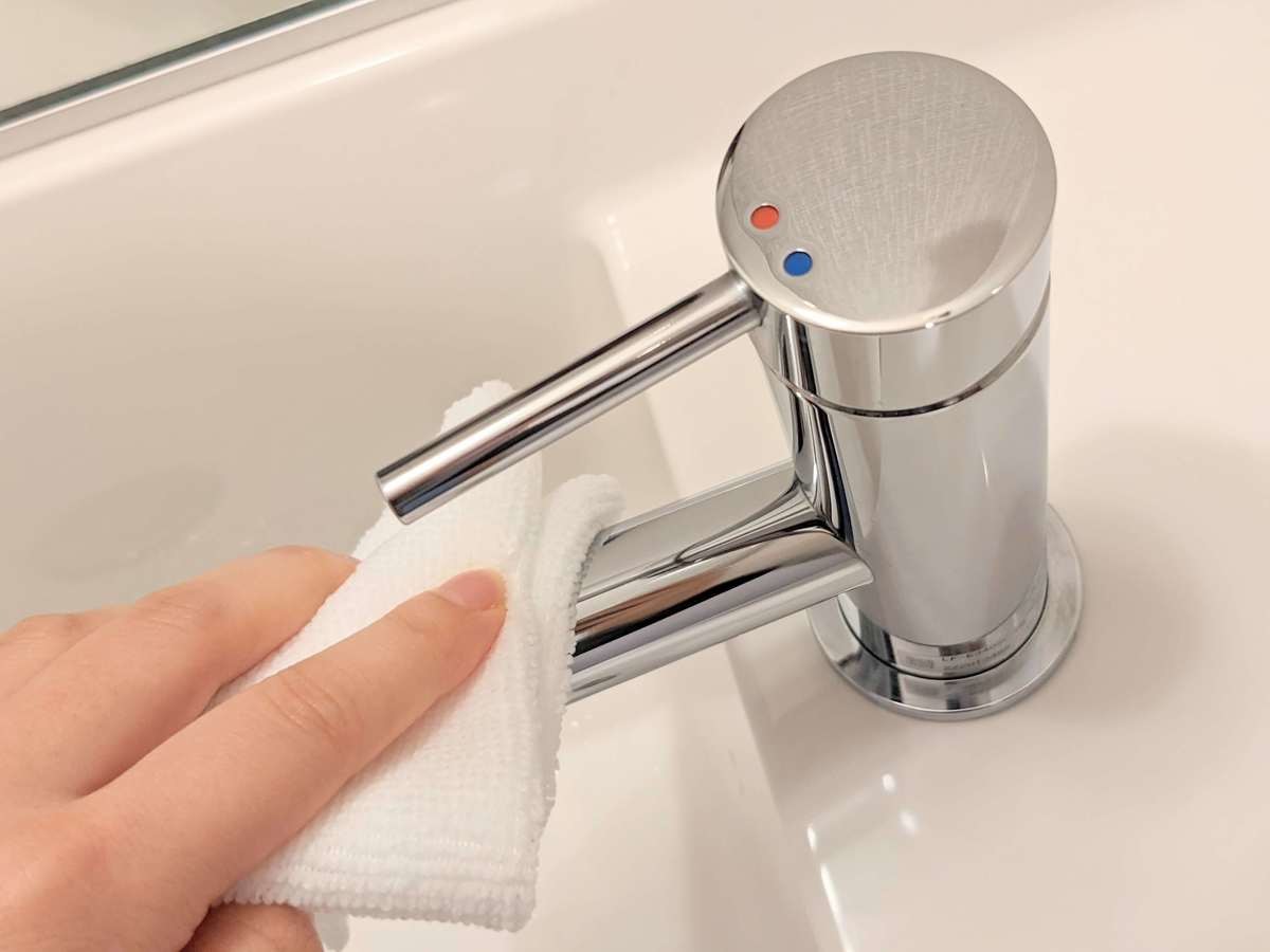 次は蛇口や鏡のお手入れに。 水拭きしたあと、乾いたマイクロファイバークロスで仕上げるとピカピカになります。