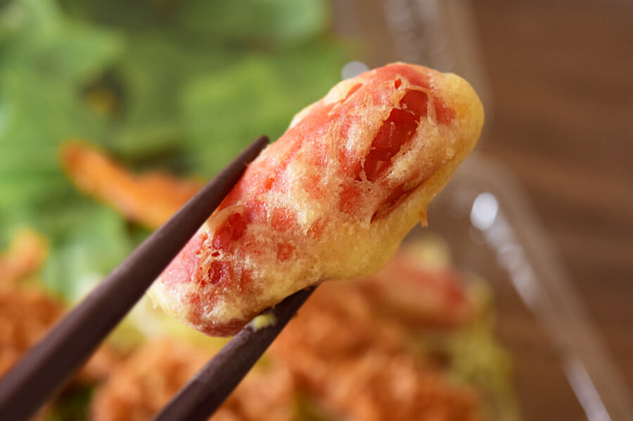 お子様ランチでよく見かける「赤いウインナー」。揚げ物専門店・かつやらしく揚げています。他具材との統一感が出ていていいですね。