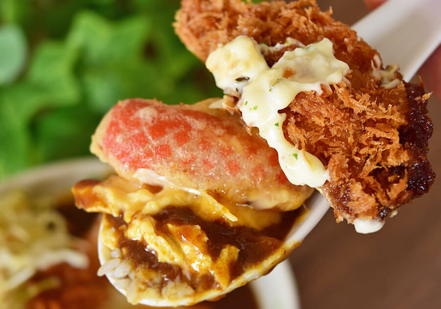 レンゲの上に、オムカレー・タルタルチキンカツ・ウインナーをのせて豪快にいただきます!カレーはピリリとくるものの、さほど辛さはありません。そこに衣サクサクなタルタルチキンカツ。