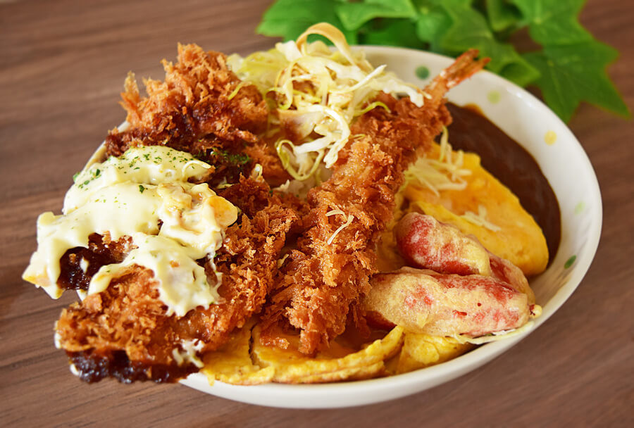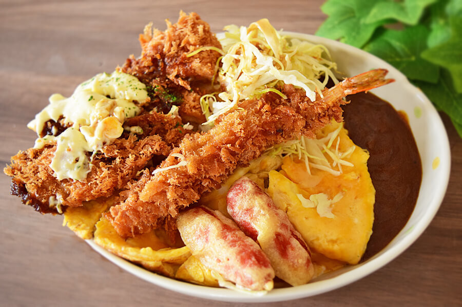 オムカレーに海老フライ・タルタルチキンカツ・ウインナーと、かつやのテイストを入れつつも例のお子様ランチを彷彿とさせるような内容。