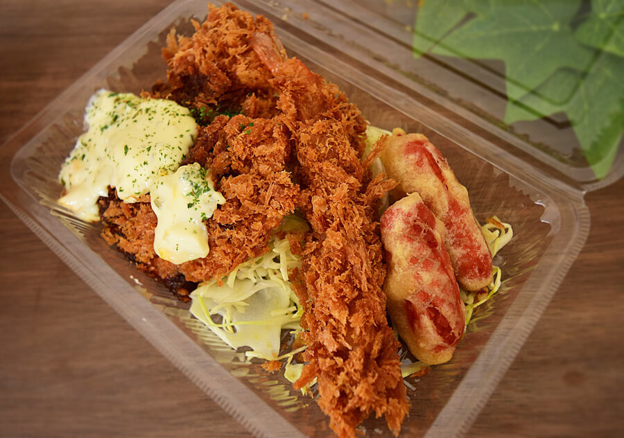 透明なパックには、海老フライ・タルタルチキンカツ・ウインナー、そして千切りキャベツが。