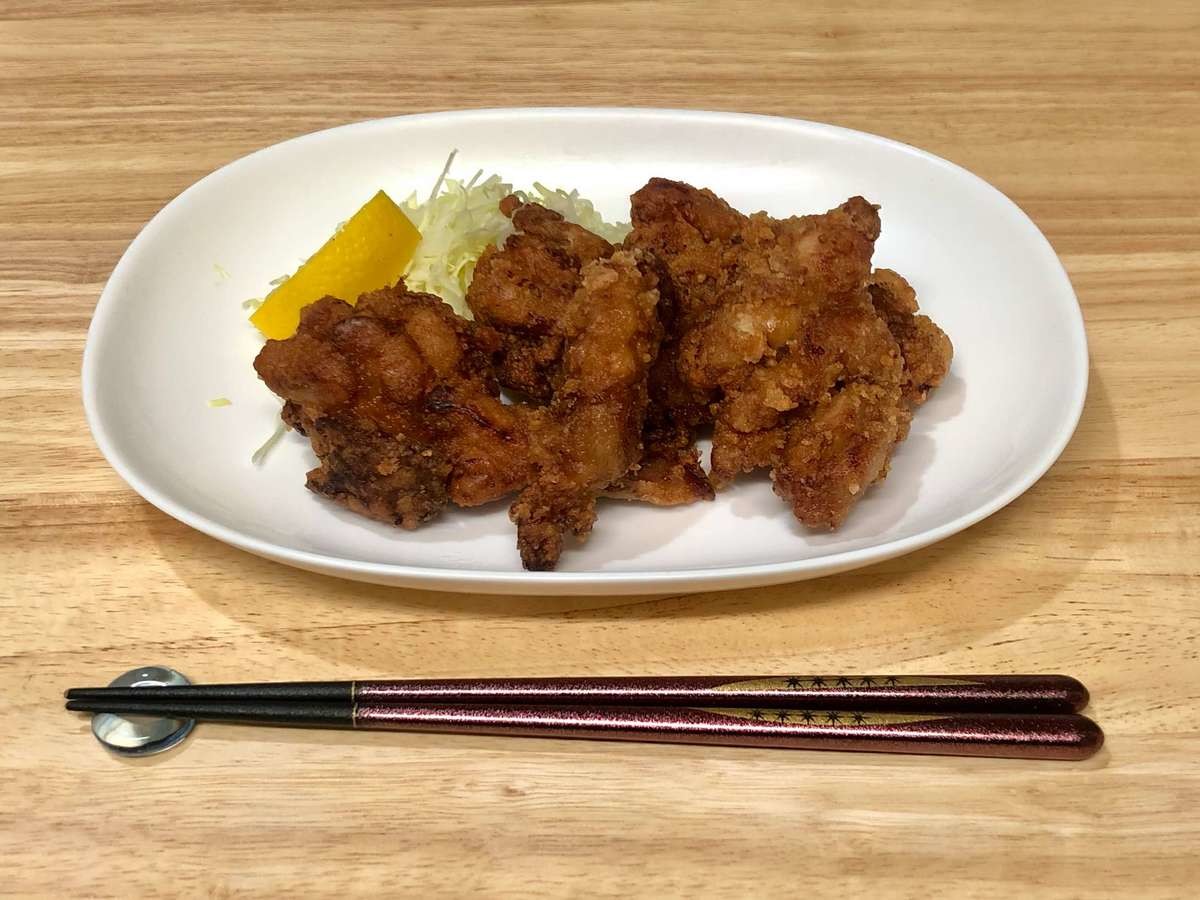 鶏もも肉1枚にしょう油、みりん、酒、にんにくなどに加え、青麻辣醤をティースプーン1杯程度加えて揚げてみました。