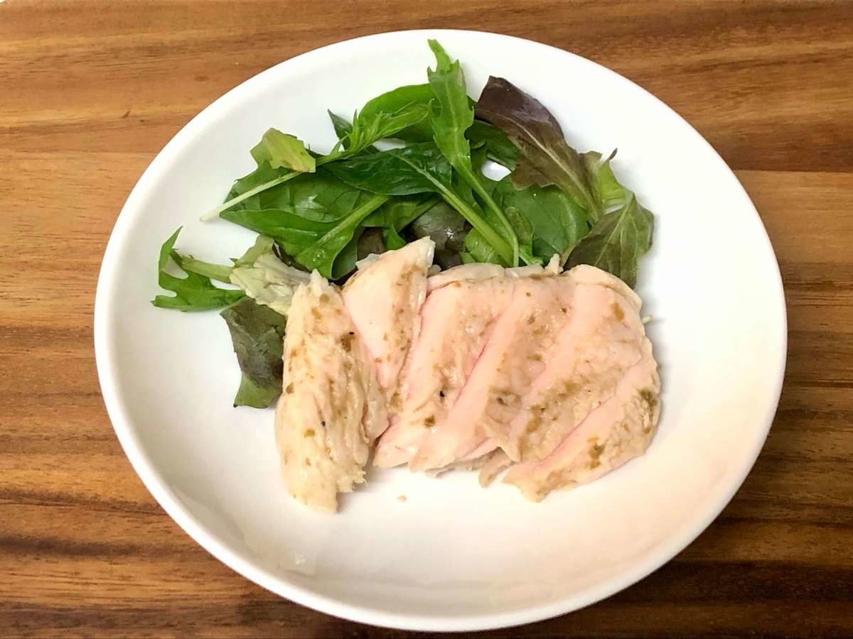 ピリ辛なサラダチキンが出来上がると想像したのですが、ピリ辛ではありますが、塩味の辛さと青唐辛子のダブルの辛さでそのまま食べるものとしては微妙な仕上がりでした。