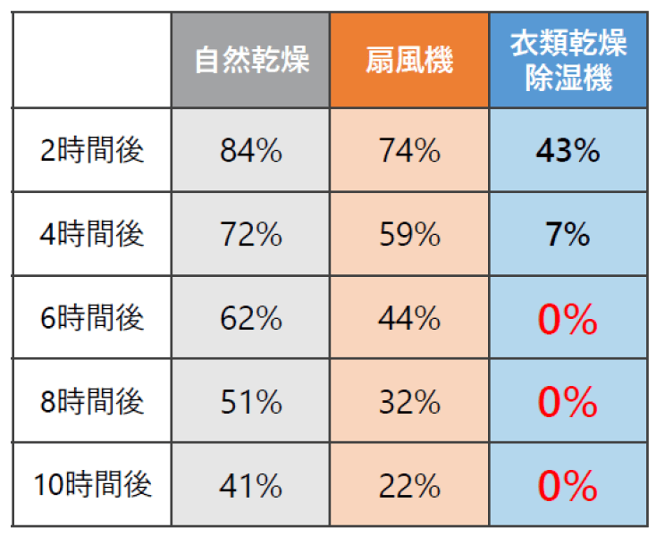 自然乾燥にいたっては10時間後も41%もの水分が残っていました。