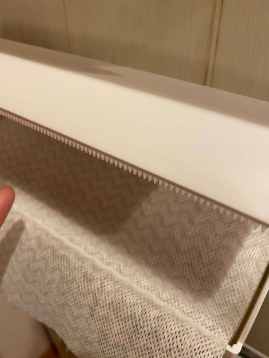 上蓋のところにギザギザが付いているので、ふきんのミシン目に合わせてカットできます。軽く上蓋を押さえるだけで、簡単にカットできますよ。