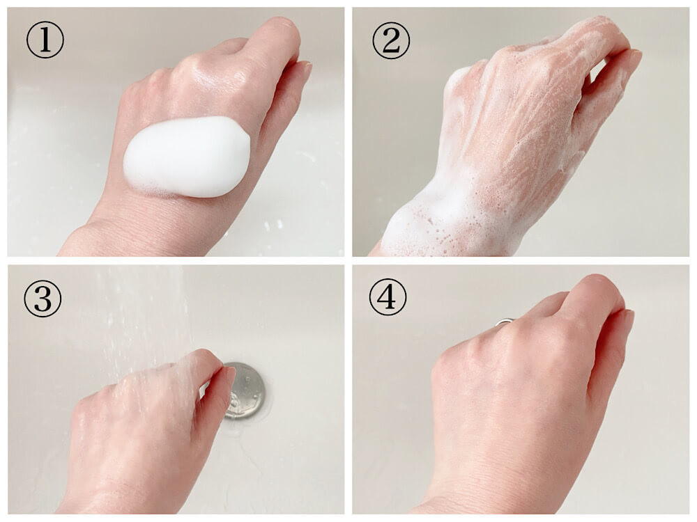 石けんの泡で優しく洗い、ぬるま湯で流すと…すっきり落ちました! これなら気兼ねなく、デコルテ・腕・足と全身に塗れますね。