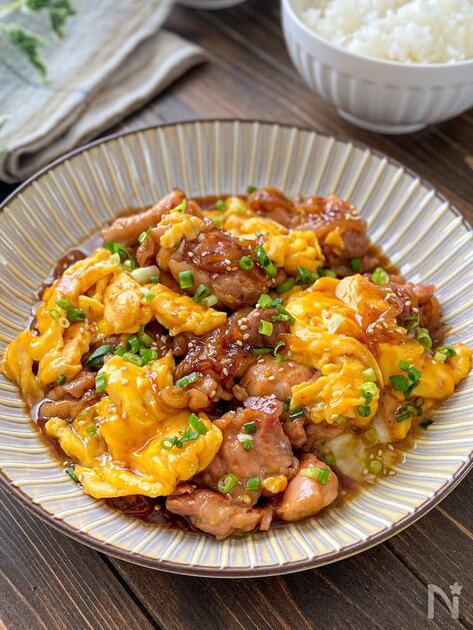 ジューシーなもも肉に、半熟スクランブルエッグをトッピングした甘酢チキンです。お肉は揚げずに焼くことで、簡単時短に。チキン南蛮よりもヘルシーですが、食べ応えは引けを取りません。