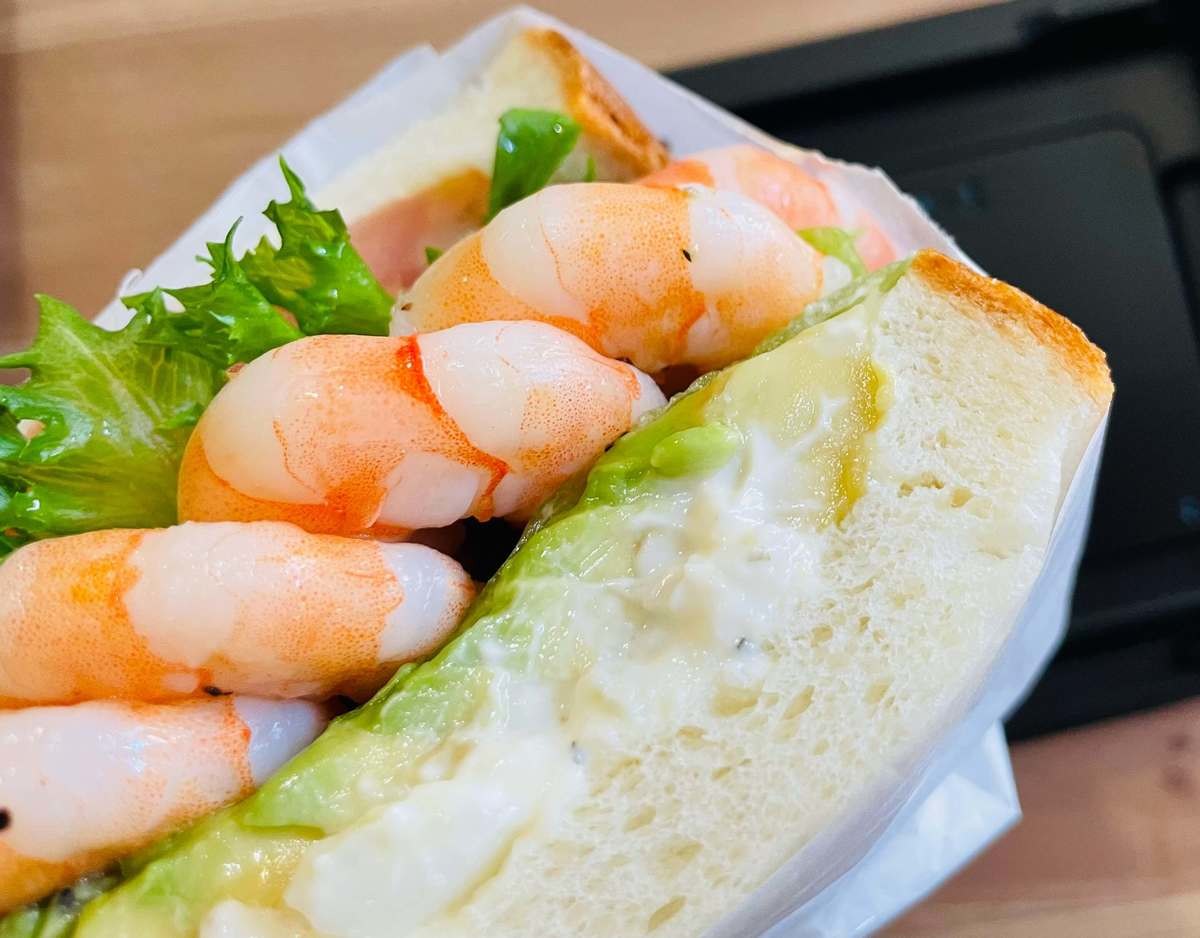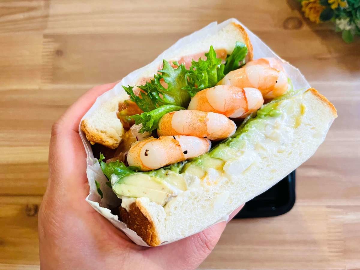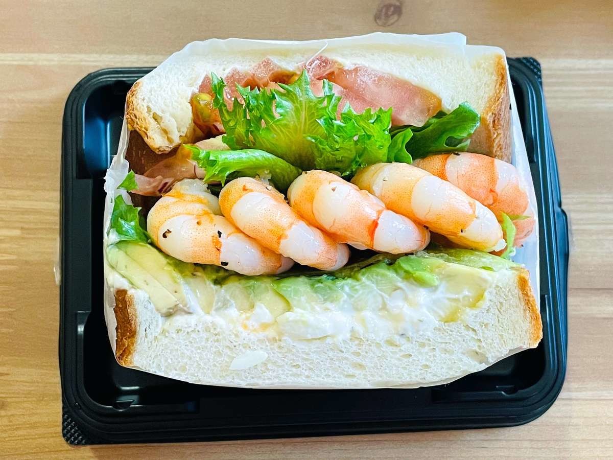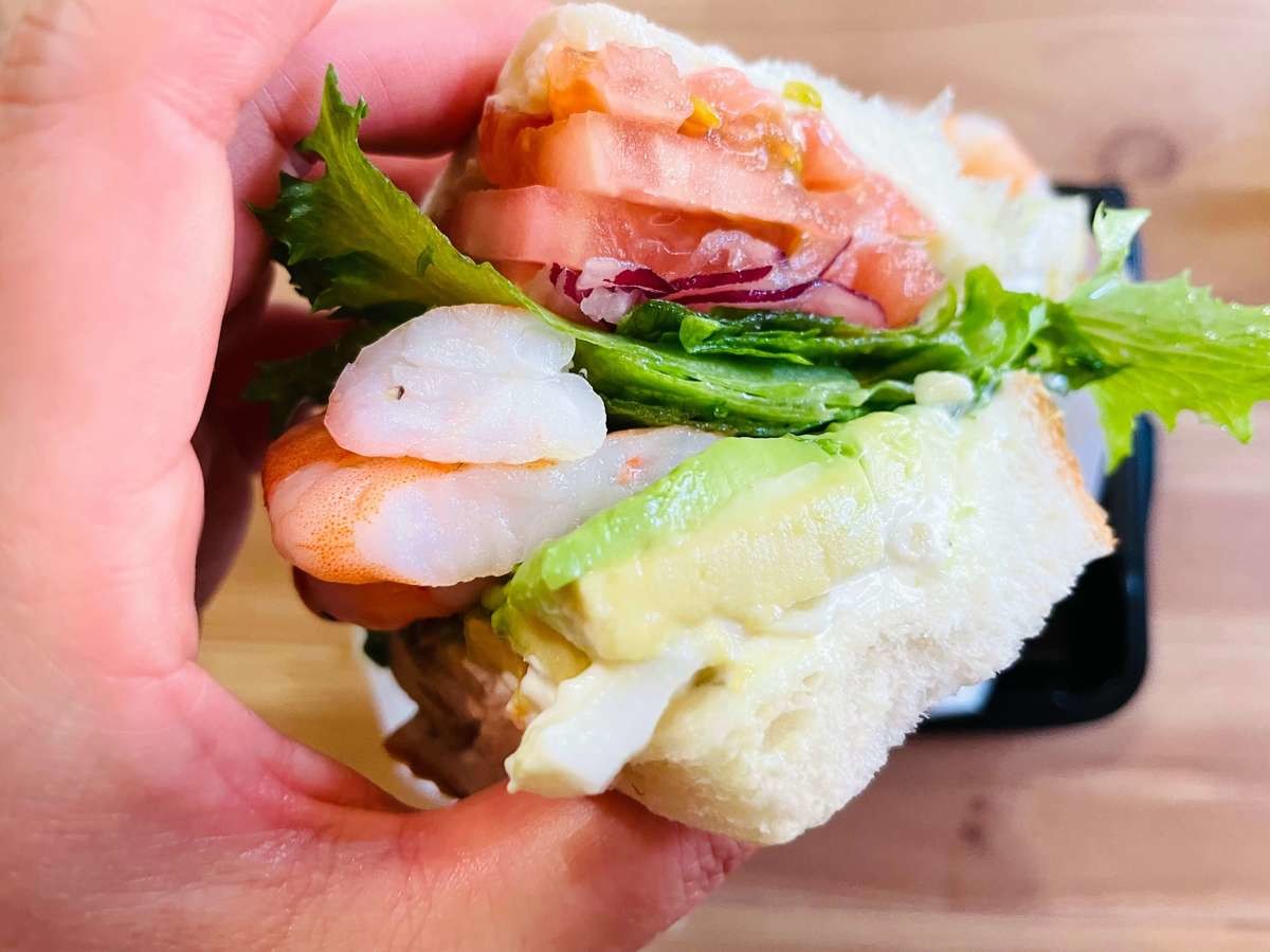 海老・アボカド・タルタルソース・トマト・リーフレタス・たまねぎなど「これでもか!」というほど分厚くサンドされています(笑)