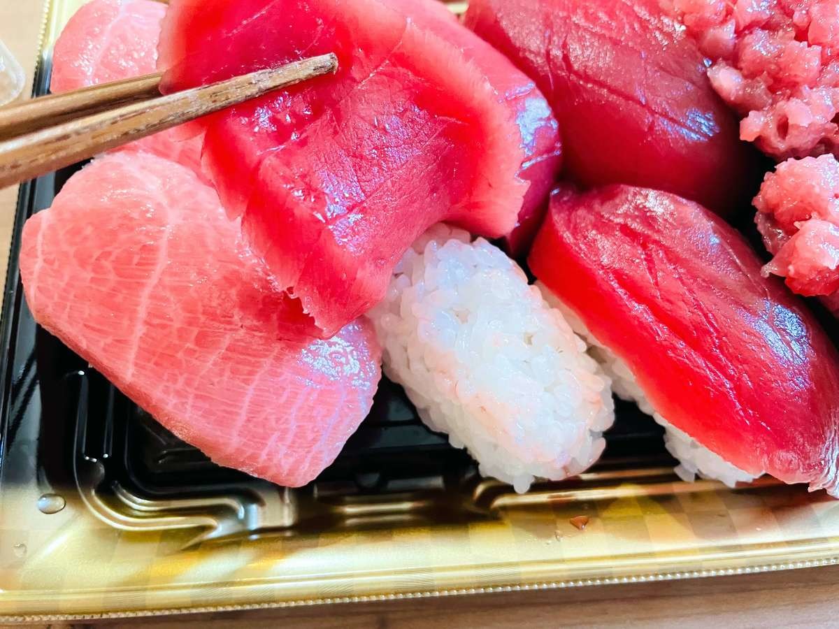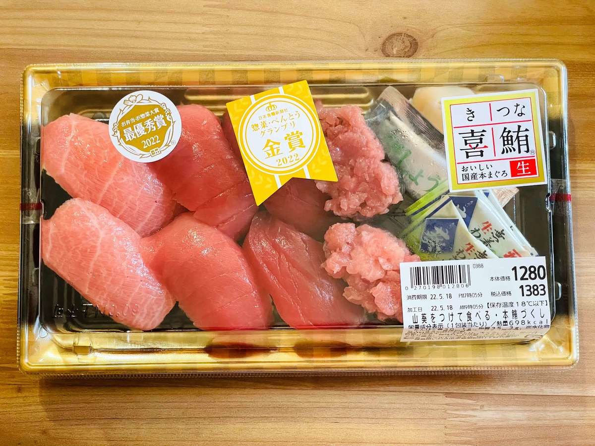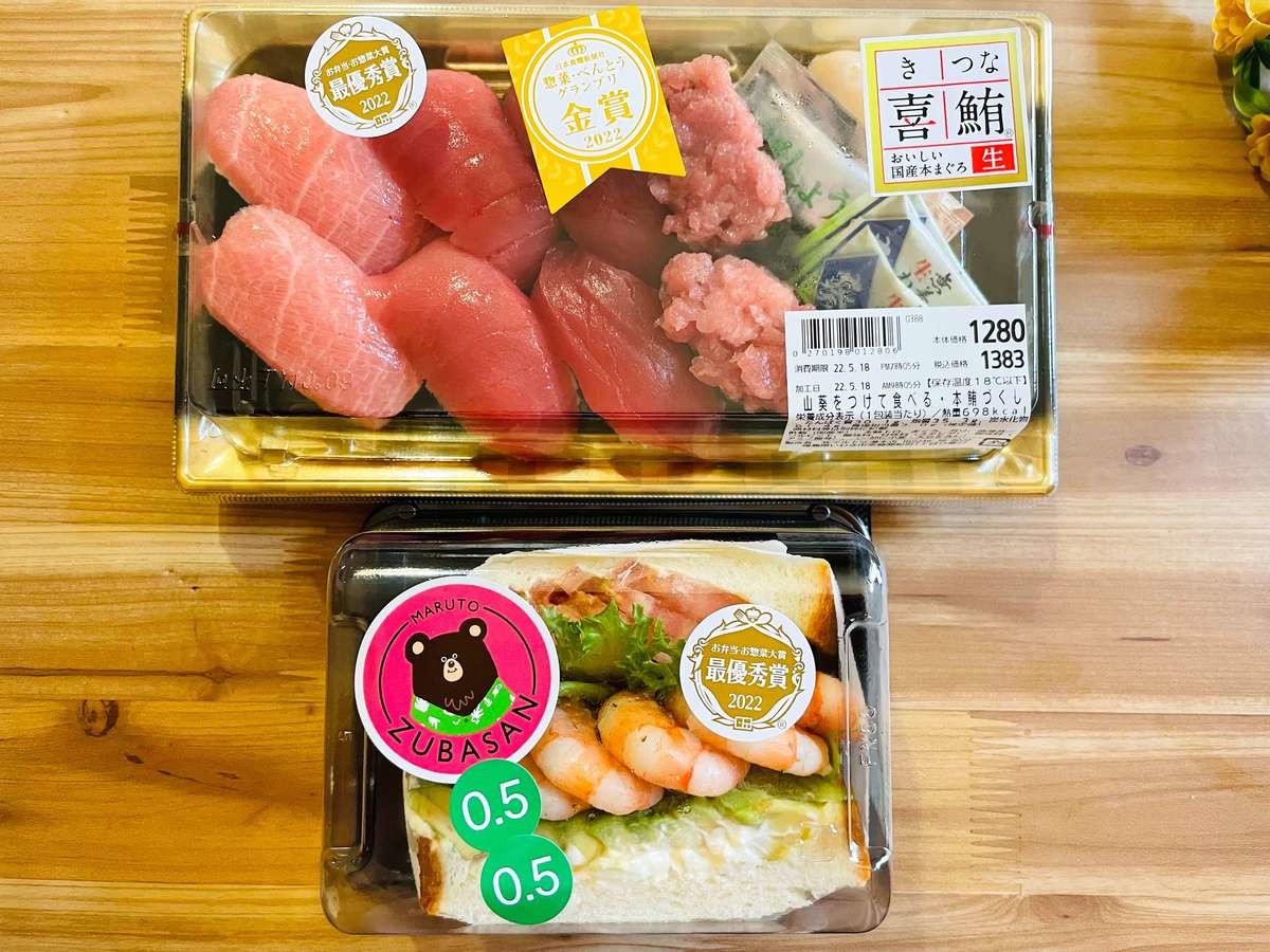 スーパーマルトの「山葵をつけて食べる・本鮪尽くし」と「ズバサン海老アボカド」の2品が「お惣菜お弁当大賞2022」で最優秀賞を受賞したとのことで購入してみました!