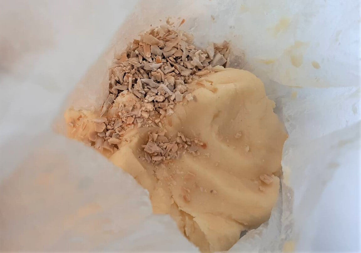 ビニール袋に小麦粉50g・砂糖10g・マーガリン20g入れて混ぜた生地に砕いたひまわりの種を混ぜます。