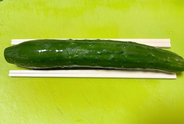 きゅうりをよく洗ったら、横向きに置き、割り箸を1本ずつ上下に添えましょう。