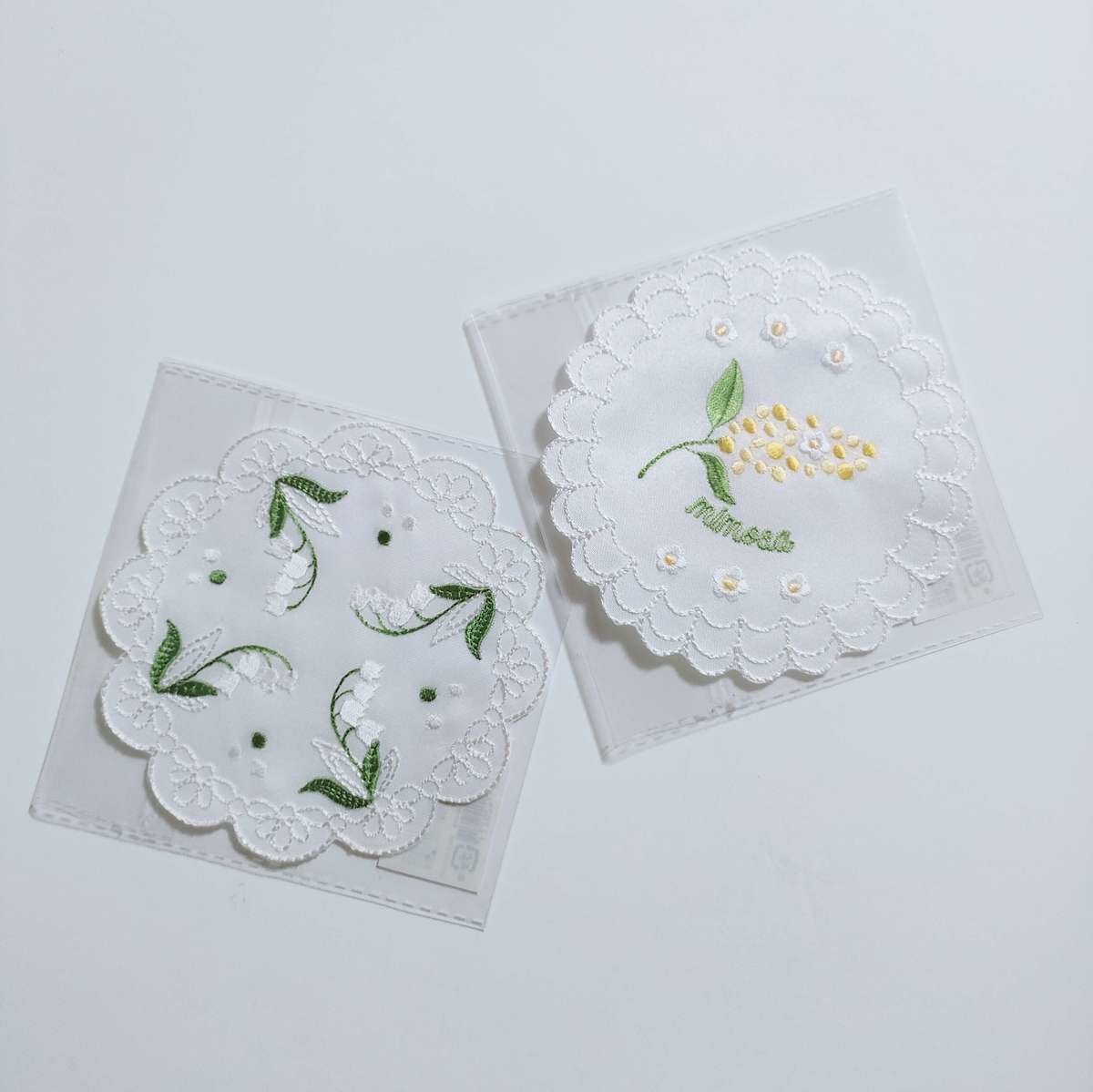 すずらんとミモザの刺繍が清楚で可愛いインテリアマットです。