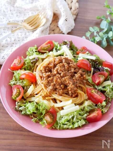 パスタ×タコライスの良いとこどり♡ガッツリ食べたいときにおすすめの、ボリュームパスタ。野菜もお肉もバランスよく食べられて、これ一品で栄養チャージすることができますよ。休日ランチ&夕食のメイン料理にぜひ!(調理時間:20分)