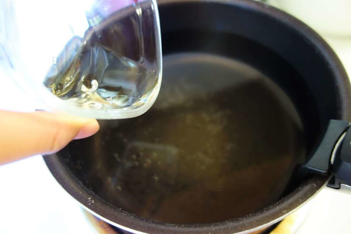 鍋に水を入れ、お酢を足して火をつけます。お酢の分量は、お湯2リットルに対し、大さじ3です。