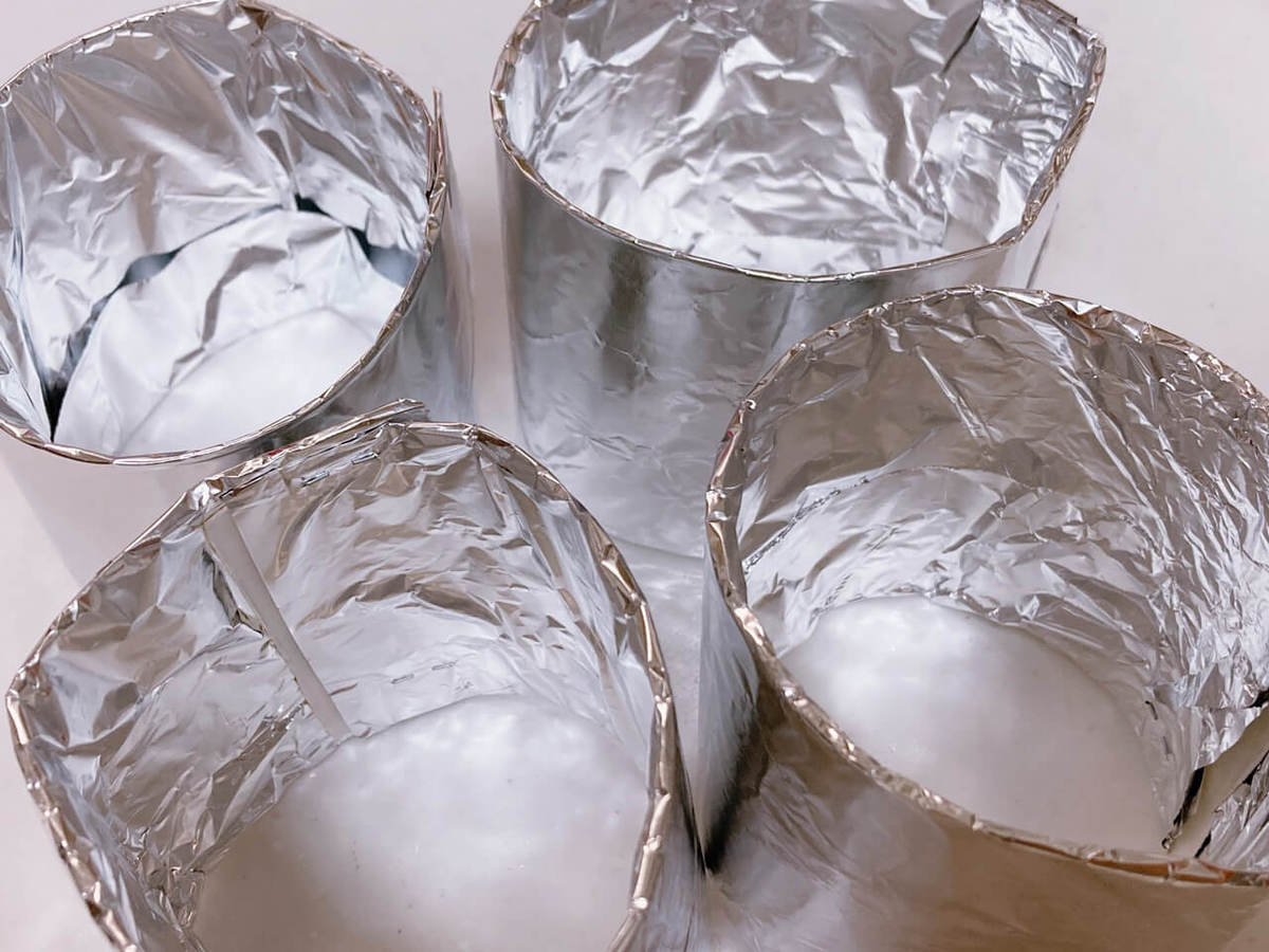 牛乳パックを開いたやつの底は捨て、それ以外は折れ目にそって細長く4つに切り分けます。アルミホイルを巻き付けてから輪っかにすると、即席の使い捨てかき揚げリングの完成です!
