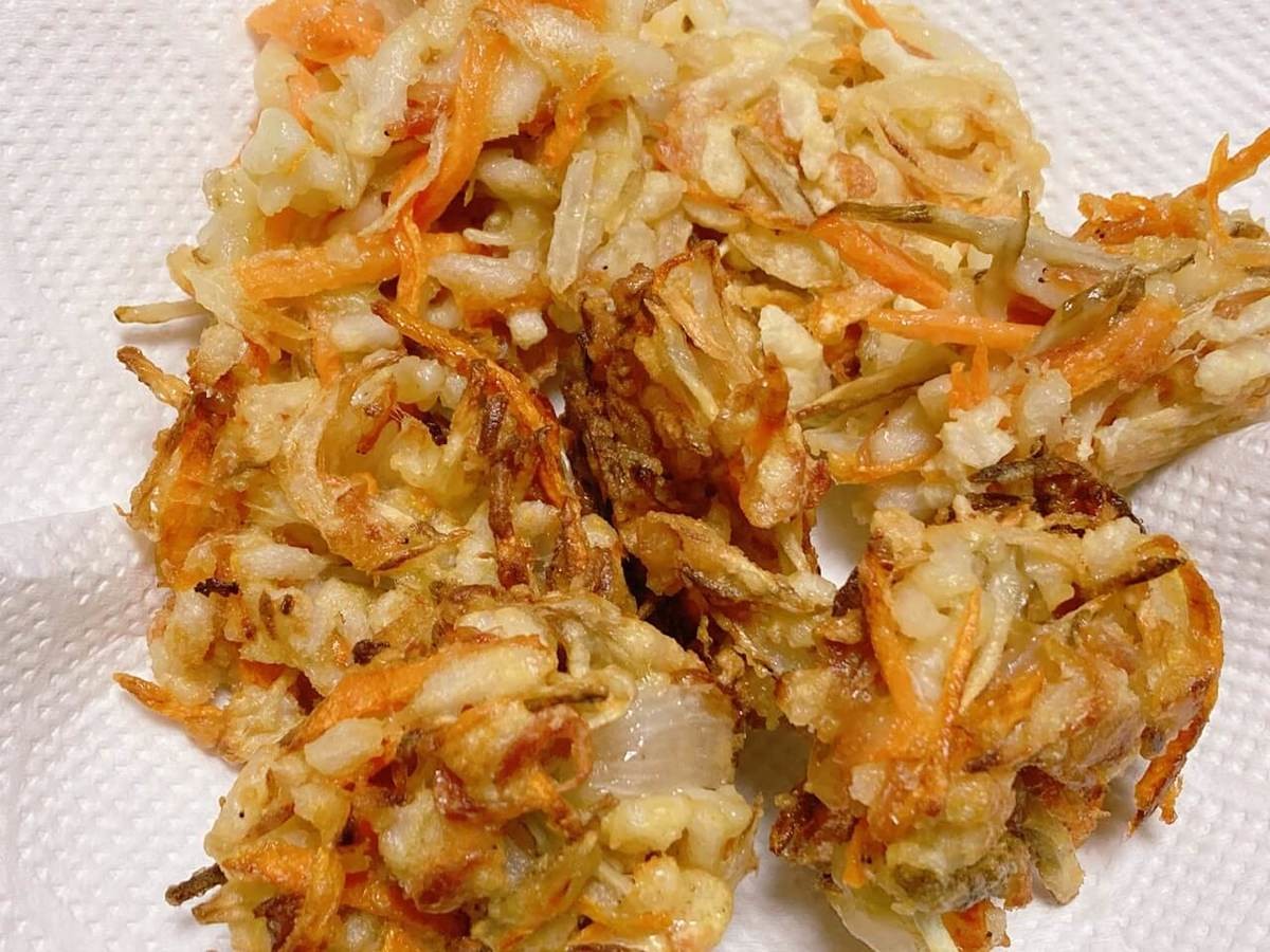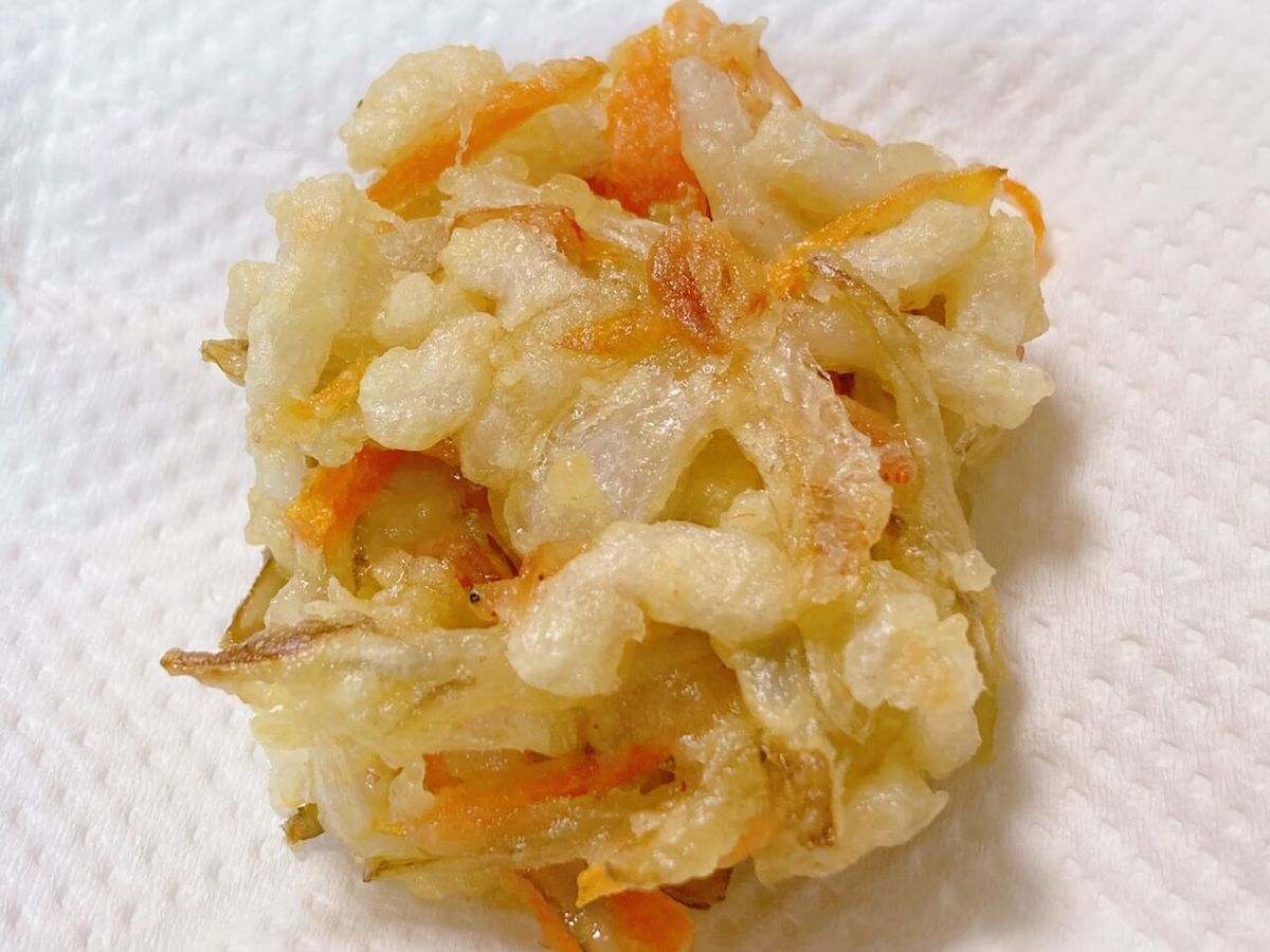玉ねぎ、にんじん、桜えびと定番の具材は押さえたかき揚げという表現がしっくり来ます。オーソドックスな仕上がりで万人受けするレシピですね。