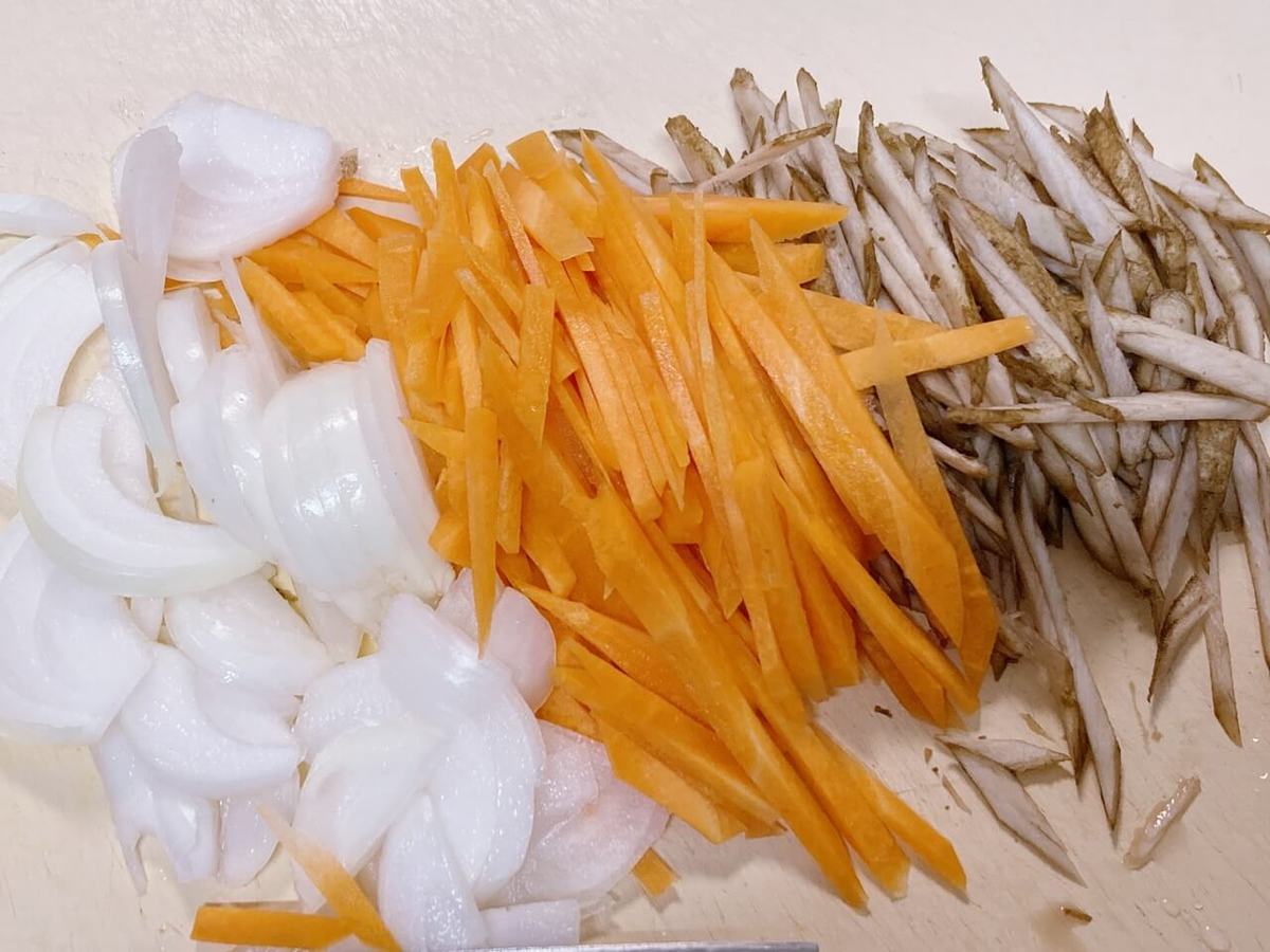 手間がかかるのは食材の千切り程度で工程もごく当たり前のかき揚げを作る手順です。かき揚げリングを活用するのがこのレシピの特徴ですが、道具なしにかき揚げをまとめるのは至難の業です。